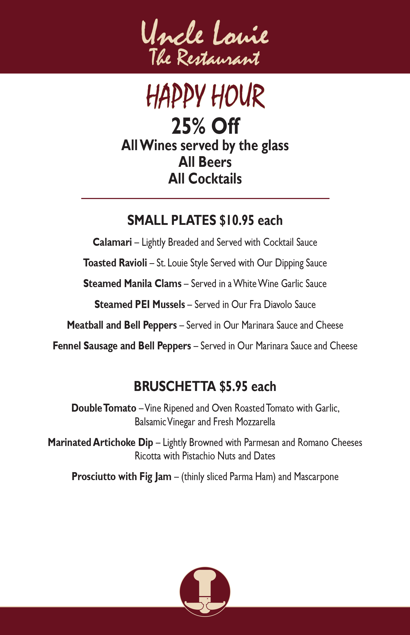 From 4 – 6 pm daily … All Wines by the Glass – 25% Off. Choose from a variety of Bruschetta, or Small Plates such as Calamari, Steamed Manila Clams, Fennel Sausage & Peppers and more! Halibut June 3, 2015 Spring Green Salad June 3, 2015 Fried Oysters June 3, 2015 Scampi Dish June 3, 2015 Seafood Salad June 3, 2015 Mussels June 3, 2015